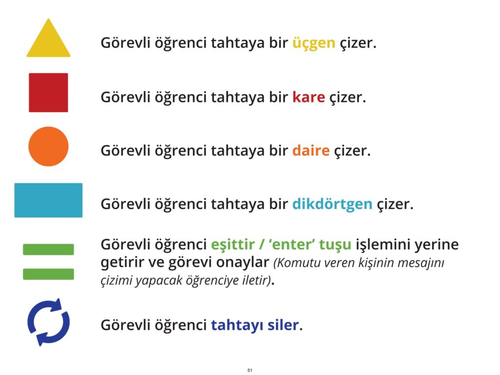 Öğrencilere “ , , , , , ” görevleri verildikten sonra yerlerinde oturan öğrencilerden, söz alarak şekil isimlerini söylemelerini isteyiniz.