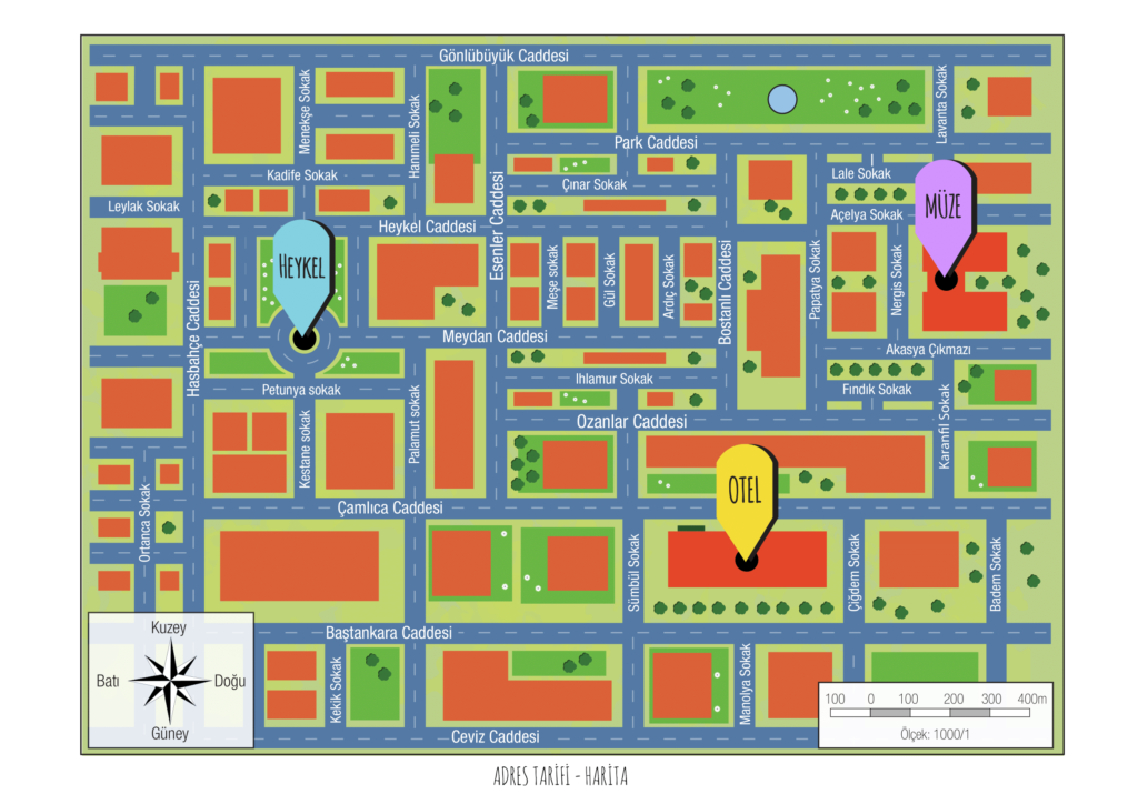 Şimdi sizinle adres tarifi ile ilgili bir etkinlik yapacağız. Bu etkinliğe göre turistik bir şehirde, bir otelde