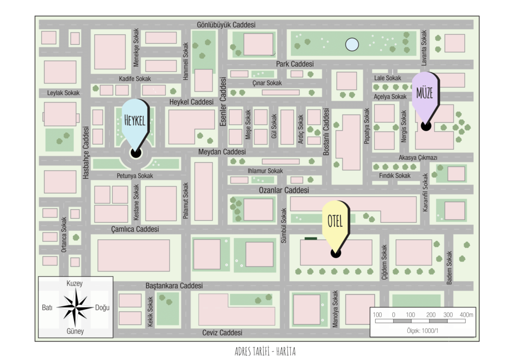 Etkinliğimizin ilk bölümünü tamamladık. Şimdi elinizdeki haritayı kullanarak benzer bir etkinlik yapacağız. Ertesi sabah yine aynı turist size gelerek, şehrinizde bulunan müzeye gitmek istediğini ve hatıra olarak şehrinizden el yapımı süs eşyası almak istediğini söylüyor. Bostanlı Caddesi, sizin şehrinize özgü, el yapımı süs eşyalarının yapıldığı ve satıldığı turistik bir cadde. Siz de turiste yolu tarif ediyorsunuz ve müzeye giderken Bostanlı Caddesi’ne de uğramasını sağlıyorsunuz. Ancak tam bu sırada yapılan kazı nedeniyle Ozanlar Caddesi’nin birkaç gün boyunca yaya ve araç trafiğine kapatıldığını hatırlıyorsunuz. Şimdi bu bilgiler ışığında turiste yolu tarif edebilir misiniz?
