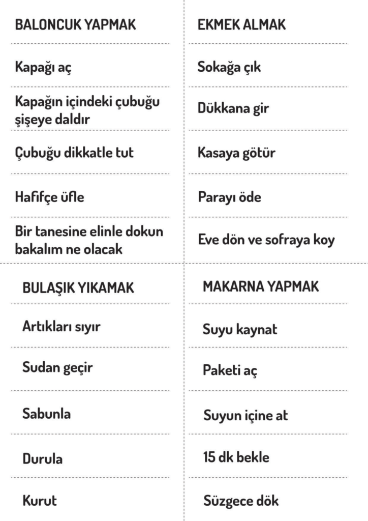 | AKTİVİTE : EKMEK ALMAK Sokağa çık Dükkana gir Kasaya götür Parayı öde Eve dön ve sofraya koy. | AKTİVİTE : MAKARNA YAPMAK Suyu kaynat Paketi aç Suyun içine at 15 dk bekle Süzgece dök |
