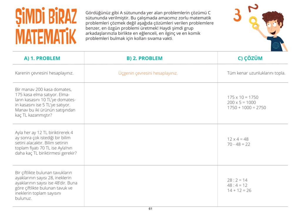 Problemlerin sadece kelimelerini değiştirerek de yeni problemler üretmeniz mümkün. Ancak en eğlenceli, en ilginç ve en komik problemleri üretmek temel hedefimiz. Şimdi grup arkadaşınızla birlikte verilen örneği inceleyerek, B sütununa aynı çözüm yöntemi ile çözülebilecek problemler yazmaya başlayabilirsiniz. Bunun için süreniz 10 dakika. Etkinliğimizin son 10 dakikasında isteyen arkadaşlarımız yazdıkları problemleri paylaşacaklar. Bakalım en çok alkışı kim alacak.