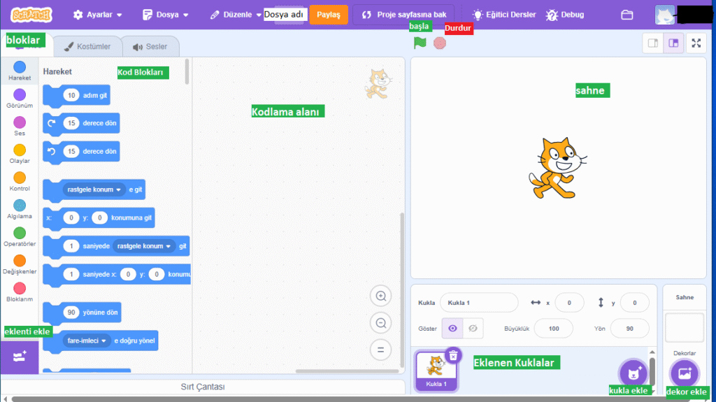 • Kod Blokları: Renkli bloklar (hareket, ses, olaylar, kontrol vb.)