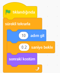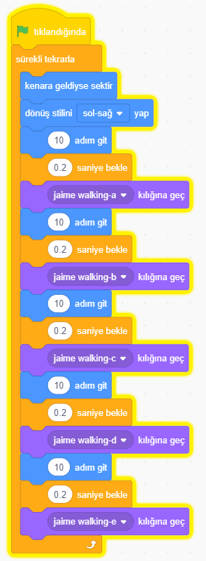 Yürüyen çocuk kuklasını ekleyelim. Kostumlerinde yürüyüş kostümleri kalsın. Aşağıdaki kod bloklarını uygulayalım.