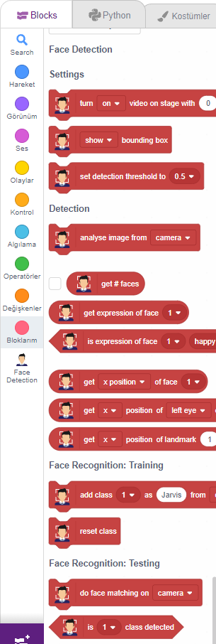 PictoBlox’da face detection eklentisinde kodlar dört kategoride bulunmaktadır.