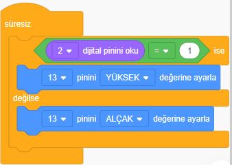 • “Pinler” kategorisinden “Pin [2] dijital değerini oku” bloğunu sürükle ve “eğer” bloğunun boşluk kısmına tak. (Buradaki [2] butonun bağlı olduğu pin numarasıdır.)