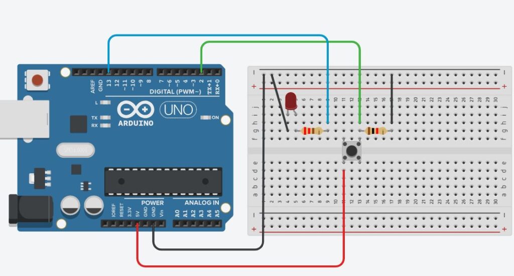 • Pin Numaraları Doğru Mu? Kodundaki pin numaraları (LED için 13, buton için 2) ile bileşenleri bağladığın pin numaraları tamamen eşleşiyor mu?