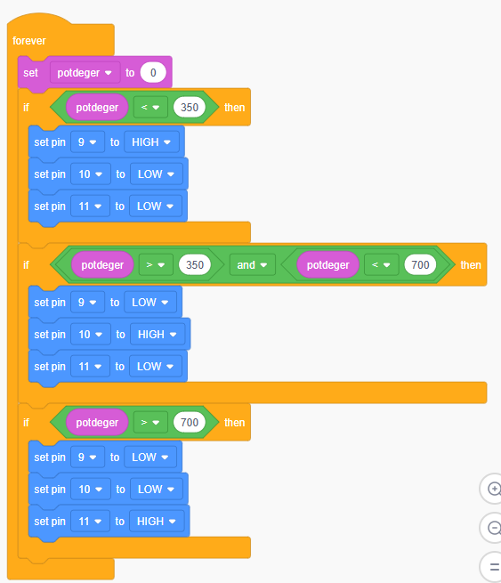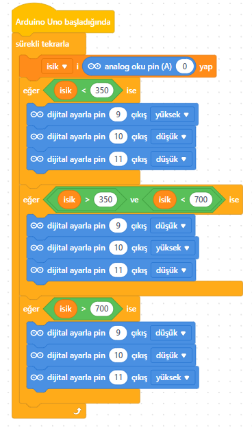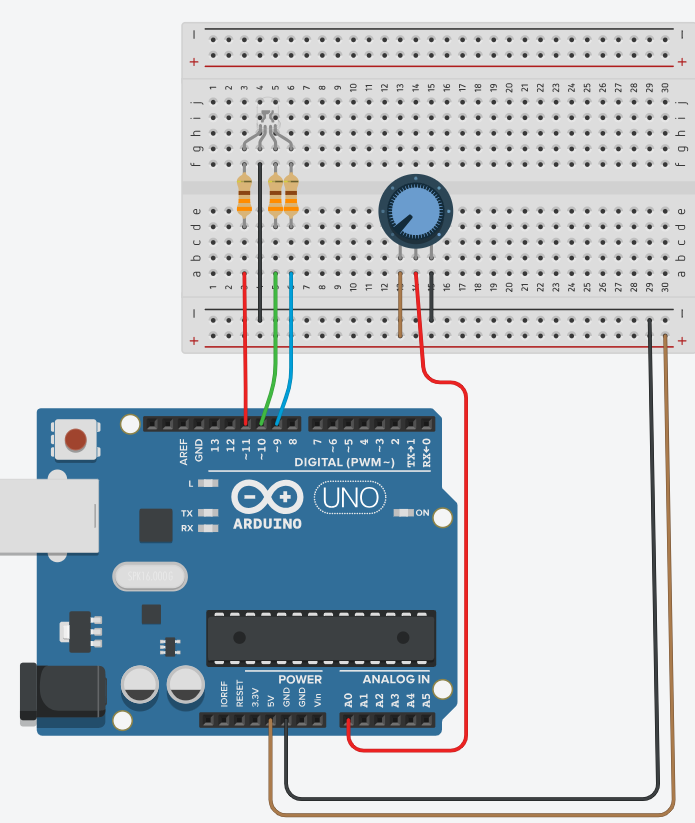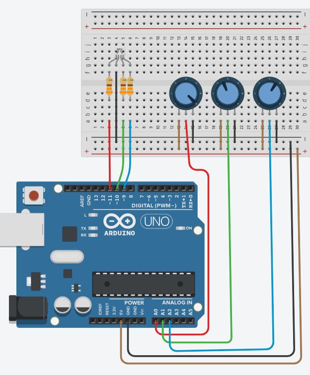 Her potansiyometre bir rengi kontrol eder: kırmızı, yeşil ve mavi. Potansiyometreyi çevirince Arduino renk parlaklığını değiştirir. 3 renk birleşerek farklı renkler oluşturur. Bu, ekranda gördüğümüz renk karışımı gibi çalışır!