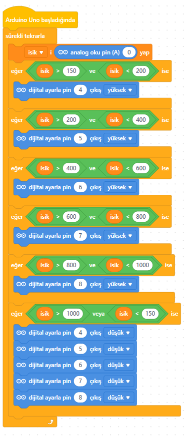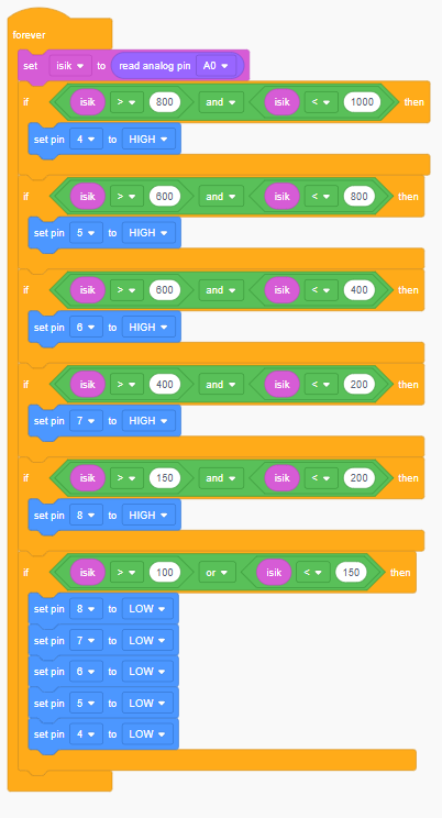 if (isik > 800 && isik < 1000) { digitalWrite(4, HIGH); } if (isik > 600 && isik < 800) { digitalWrite(5, HIGH); } if (isik > 600 && isik < 400) { digitalWrite(6, HIGH); } if (isik > 400 && isik < 200) { digitalWrite(7, HIGH); } if (isik > 150 && isik < 200) { digitalWrite(8, HIGH); } if (isik > 100 || isik < 150) {