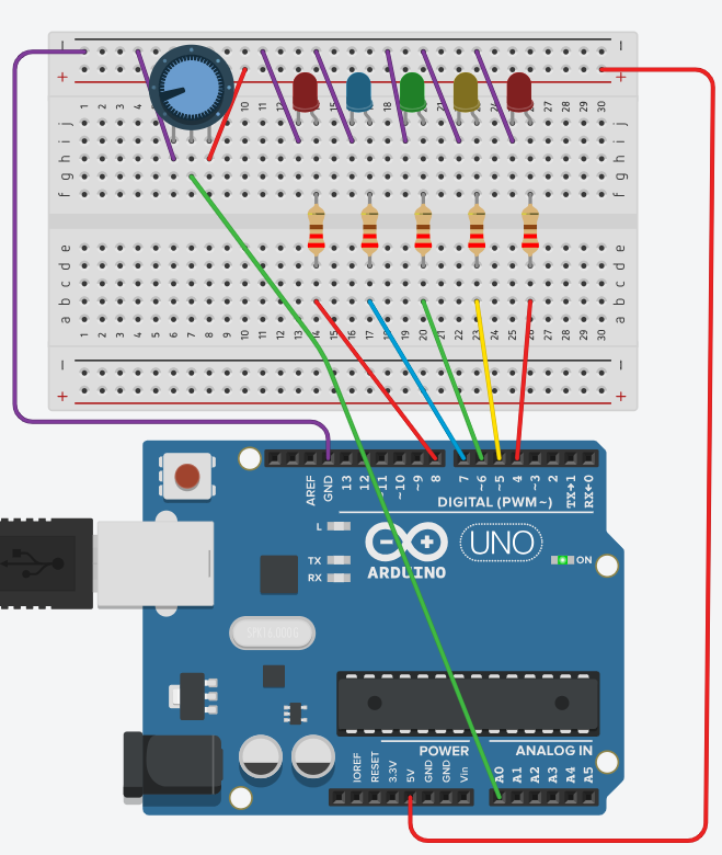 Bu projede 5 tane LED ışık var. Işıklar sırayla yanıyor ve sönüyor. Potansiyometreyi çevirerek bu ışıkların yanma hızını değiştirebiliyoruz. Bu da tıpkı bir ışık gösterisi gibi oluyor!