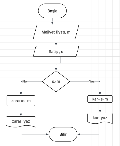 Maliyet fiyatı ve satış fiyatı olmak üzere iki girdi alan bir akış şeması oluşturalım . Daha sonra bu değerlere bağlı olarak kâr veya zararı hesaplayıp aynı sonucu yazdıralım .